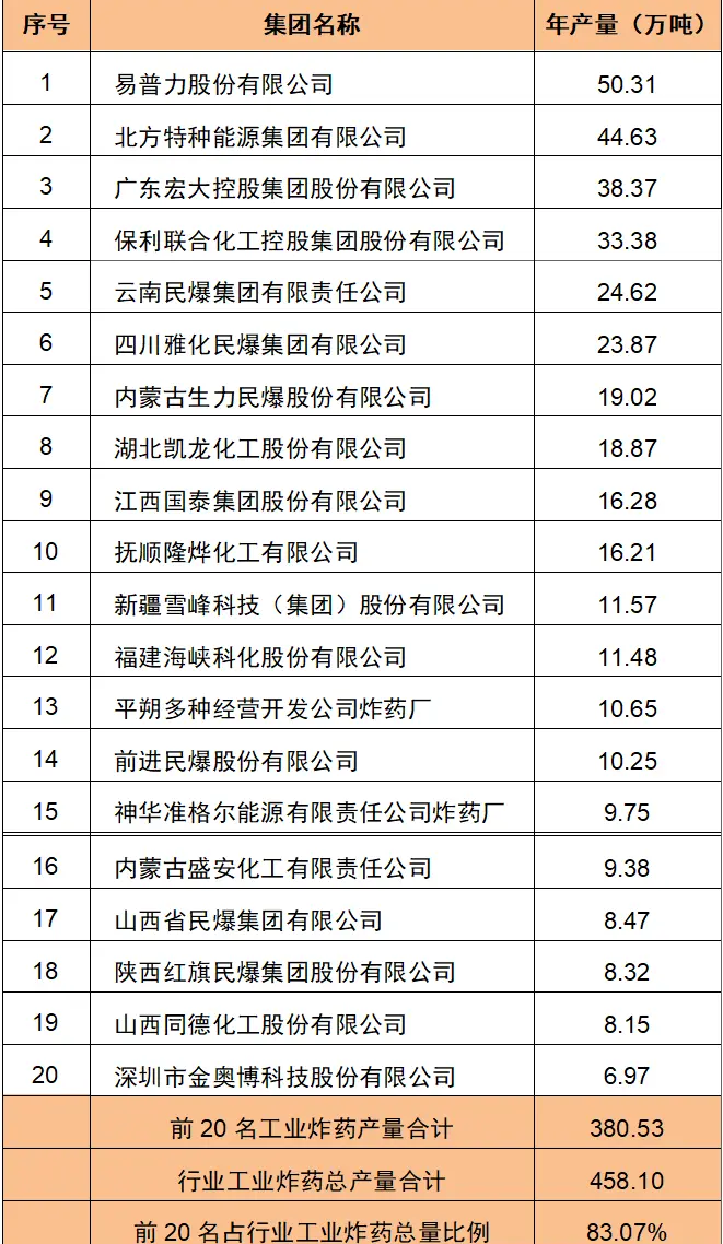 民爆行业需求稳增,而供给总量受到政策严格限制。最新统计显示,2023年行业排名前20家企业集团合计炸药产量达381万吨,约占行业总产量的83%,较上年增长约5个百分点。在政策推动集中度提升背景下,叠加下游矿山大型化动工,头部企业市占率提升。