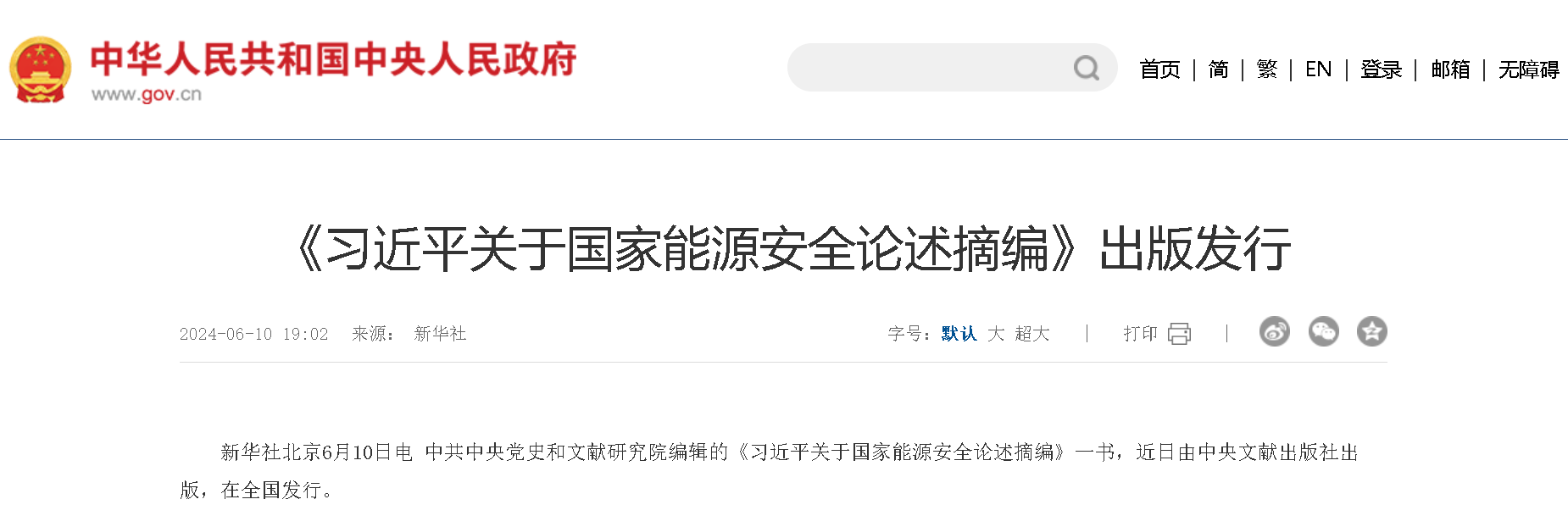 新华社北京6月10日电,中共中央党史和文献研究院编辑的《习近平关于国家能源安全论述摘编》一书,近日由中央文献出版社出版,在全国发行。