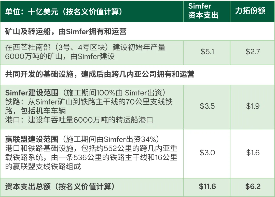 力拓表示,共同开发西芒杜项目基础设施运力及相关建设的成本将由Simfer和赢联盟均摊。根据共同开发公约,Simfer和赢联盟将分别负责不同的基础设施建设。Simfer将建设一条约70公里长的Simfer支线铁路和一个年吞吐量6000万吨的转运船(TSV)港口;赢联盟将建设约536公里长的双轨铁路主干线和约16公里长的赢联盟支线铁路,以及一个年吞吐量6000万吨的驳船港口。建成后,所有共同开发的基础设施和机车车辆将注入并移交给合资企业跨几内亚公司(CTG)运营,Simfer和赢联盟各持有该公司42.5%的股权,几内亚政府持有其15%的股权。
