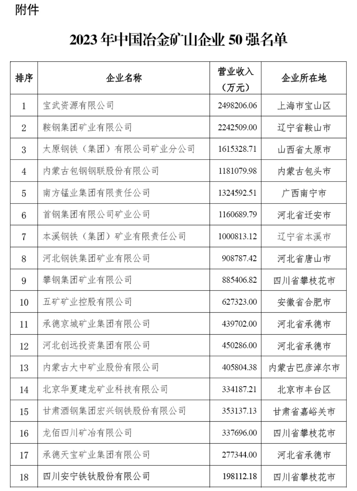为持续推动冶金矿山高质量发展,发挥国资央企的示范引领作用,提高行业凝聚力和矿山企业社会影响力,中国冶金矿山企业协会参照国际通行做法,以企业年营业收入为主要依据,综合考虑企业资产规模、盈利能力、产品产量、掌控资源量等因素,确定发布50强名单。