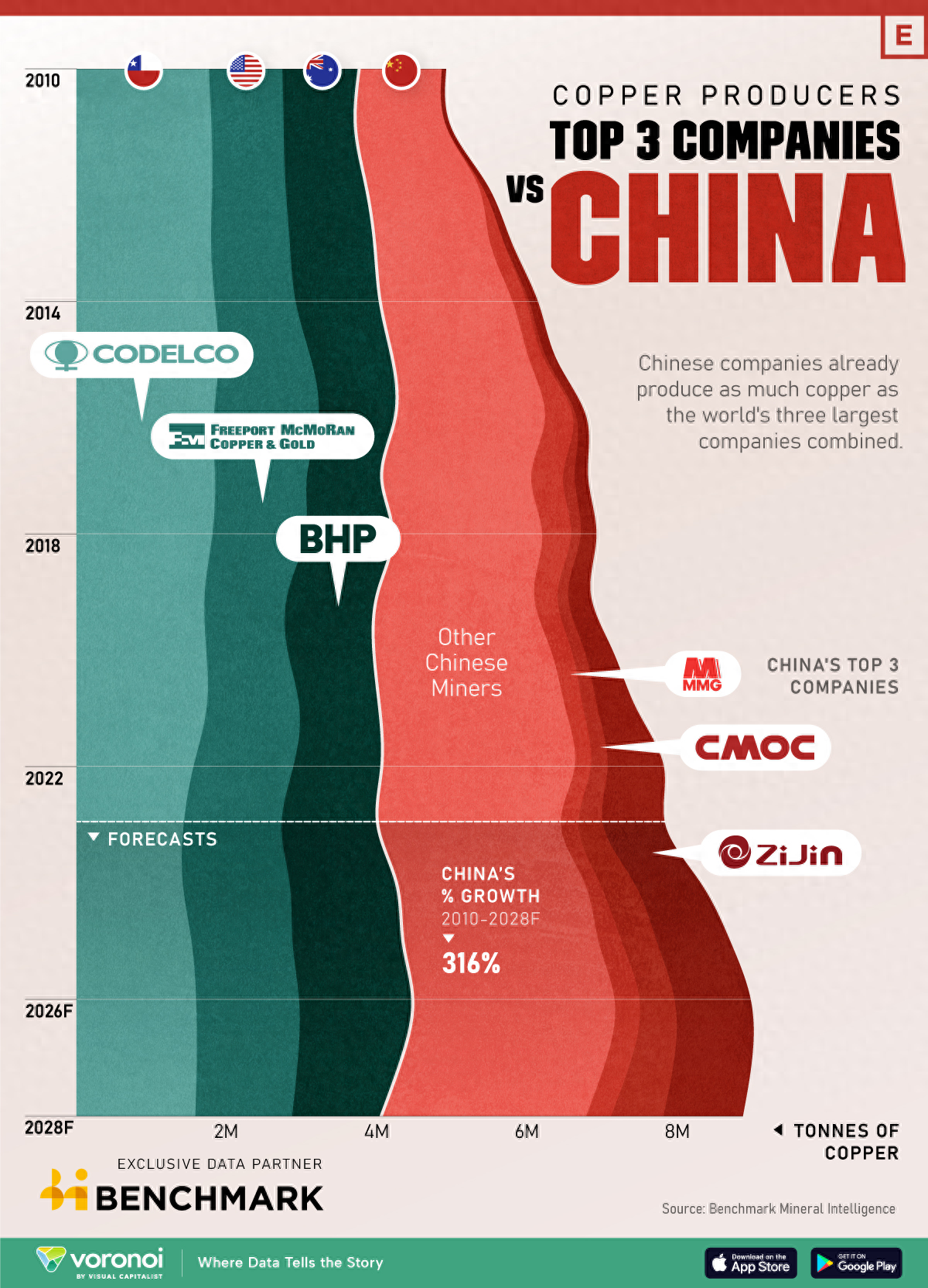 中国铜矿企业可视化增长 明年预计超过全球三大铜矿商之和 时间 :2024-08-20 10:46:55点击 : 中国拥有庞大的制造业,是迄今为止最大的铜消费国。 目前,中国使用的铜有 70% 是进口的。因此,中国对铜矿进行了大量投资,以确保未来的供应。 这幅由 Visual Capitalist Elements 制作的图表比较了全球三大铜矿生产商与中国矿商的铜产量。由于一些矿山的所有权是共有的,因此本图只考虑了公司在每个矿山所占股份的产量部分。 到 2025 年,中国矿商将超越主要生产商 2010 年,中国矿商共生产了 120 万吨铜。同年,第一大铜生产商智利国营矿业公司 Codelco 的产量为 180 万吨,而全球最大的矿业公司和第二大铜生产商必和必拓的产量为 100 万吨。 然而,多年来,中国产量激增,而主要矿商却面临挑战。2023 年,由于运营问题和项目延误,Codelco 的产量降至四分之一世纪以来的最低水平。 与此同时,中国最大的铜生产商紫金矿业的产量从 2010 年的 05.9 万吨上升到去年的 80 万吨。 2023 年,中国企业的铜产量合计为 320 万吨,而智利国家铜矿公司(Codelco)、自由港公司(Freeport-McMoRan,美国最大的铜生产商)和必和必拓(BHP)的铜产量合计为 400 万吨。 根据基准矿产情报机构(Benchmark Mineral Intelligence)的数据,预计到 2025 年,中国矿商的铜产量将超过三大生产商,总产量将达到 440 万吨,而智利国家铜矿、必和必拓和自由港的总产量为 430 万吨。 来源:Visual Capitalist - Elements, 加拿大矿业网 / KMC 编译 返回回首页 上一案例:伍德麦称,中国多元化发展将给铜供应链带来850亿美元缺口 下一案例:中矿资源赞比亚卡通巴铜矿开工