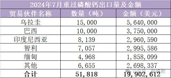 2024年1-7月中国重过磷酸钙出口量为32.55万吨,2024年7月中国重过磷酸钙出口量为5.18万吨。2024年7月重过磷酸钙出口国为乌拉圭、巴西、印度尼西亚。其中出口至乌拉圭的量为1.5万吨,出口至巴西的量为1万吨,出口至印度尼西亚的量为0.81万吨。2024年7月重过磷酸钙出口省份排名依次为云南、贵州、广西等,其中云南出口量为3.75万吨,贵州出口量为1.12万吨,广西出口量为0.29万吨。